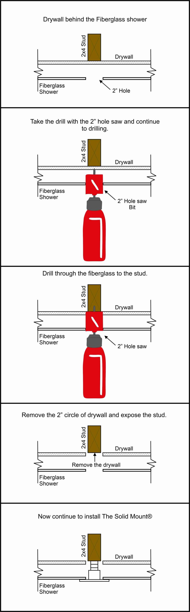 Depending on your location, you may discover drywall behind the fiberglass shower. While this isn’t a significant problem, it does require a few additional straightforward steps. Click on the image to view the necessary procedures. Utilizing the 2″ hole saw to drill through the drywall and extract a 2″ section in front of the stud. Following the removal of the drywall, proceed with the installation of The Solid Mount® according to the provided instructions. (Double click on the image to enlarge it.)