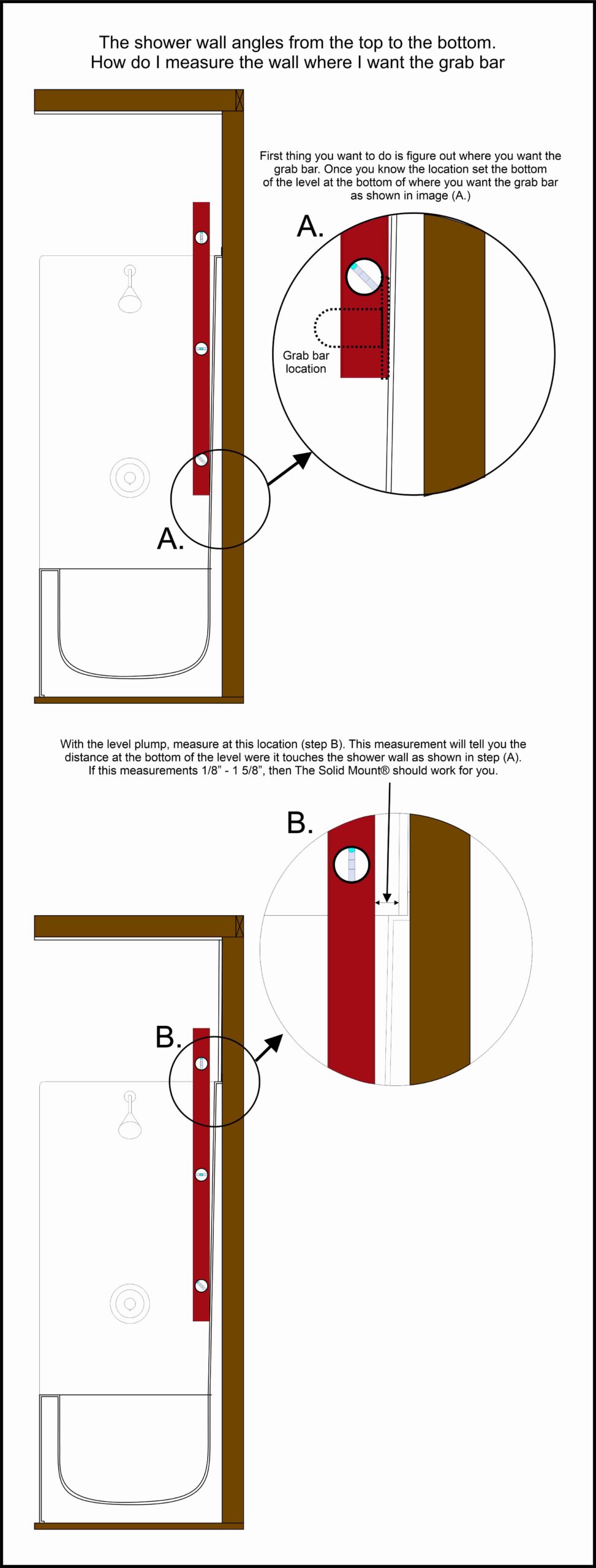 Curved shower walls are not an obstacle for installing The Solid Mount® in fiberglass showers. Despite some floating ideas like shaving an angle on the threaded shaft to angle the bar, the correct process is actually very simple. By following the instructions, you can easily install the bracket, even if one side has a larger gap than the other. Simply fill in the gap with caulking. While it may not be the most aesthetically pleasing solution, it is a practical one that saves you time and money. There’s no need to tear out the back wall and add blocking. Don’t waste your energy on a complete shower replacement. With The Solid Mount®, you can confidently install grab bars in your curved shower. (Double click on the image to enlarge it.)