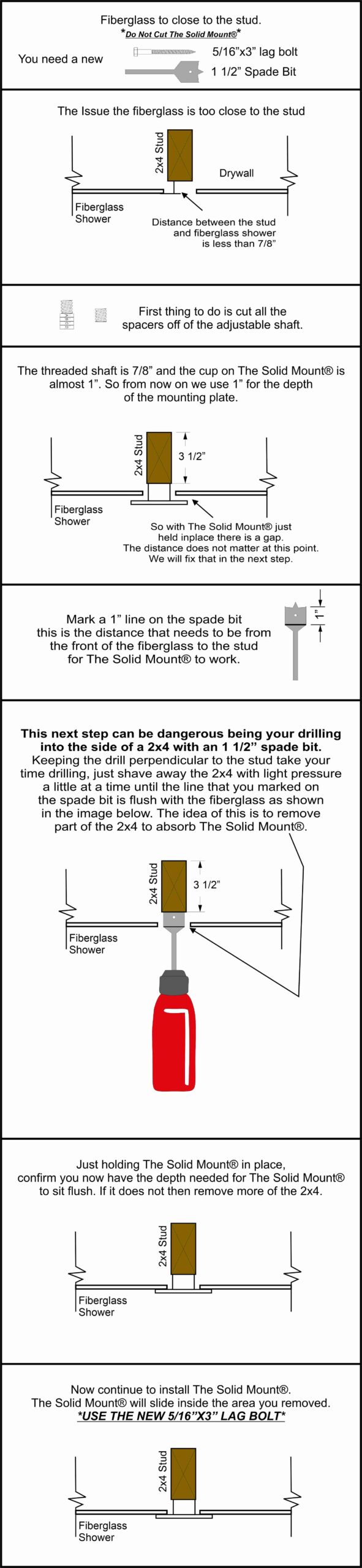 This situation may seem like a disaster – drilling a 2″ hole in your fiberglass shower might appear to prevent the use of this incredible product. However, fear not. The Solid Mount® is highly versatile, and we have a solution for you; it just requires a bit more time and an additional tool, a 1.5″ spade bit. While this step can be a bit precarious, we recommend using a brand new, sharp spade bit and taking your time. We’ve provided detailed steps along with accompanying images to guide you through the process safely. (Double click on the image to enlarge it.)