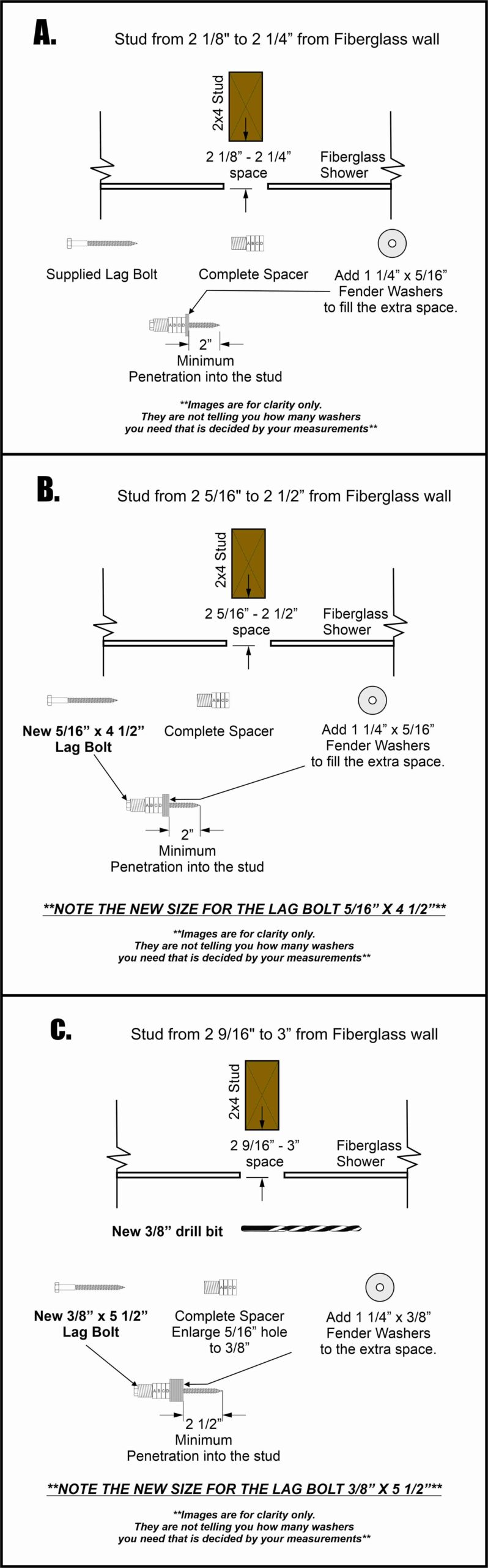 For spaces exceeding 2 1/2″ up to 3” (See image C), a more thorough approach is warranted. Begin by obtaining a 3/8” drill bit and a 15/64″ drill bit for the pilot hole, and a supply of 3/8” x 1 1/4” fender washers to fill the gap. It’s vital to maintain uniformity in washer size. Additionally, enlarge the 5/16” hole in the spacer to 3/8” to accommodate the larger lag bolt. You can achieve this by using a 3/8″ drill bit, ensuring a snug fit for the 3/8” lag bolt. Lastly, acquire a new 3/8” x 5 1/2″ lag bolt, ensuring it penetrates at least 2 1/2″ into the stud for optimal stability. Also use the 15/64″ drill bit for the pilot hole for the 3/8″ lag boltWe need to change the 5/16″ lag bolt to a 3/8″ lag bolt with 2 1/2″ of penetration due to load changes. (Double click on the image to inlarge it.)